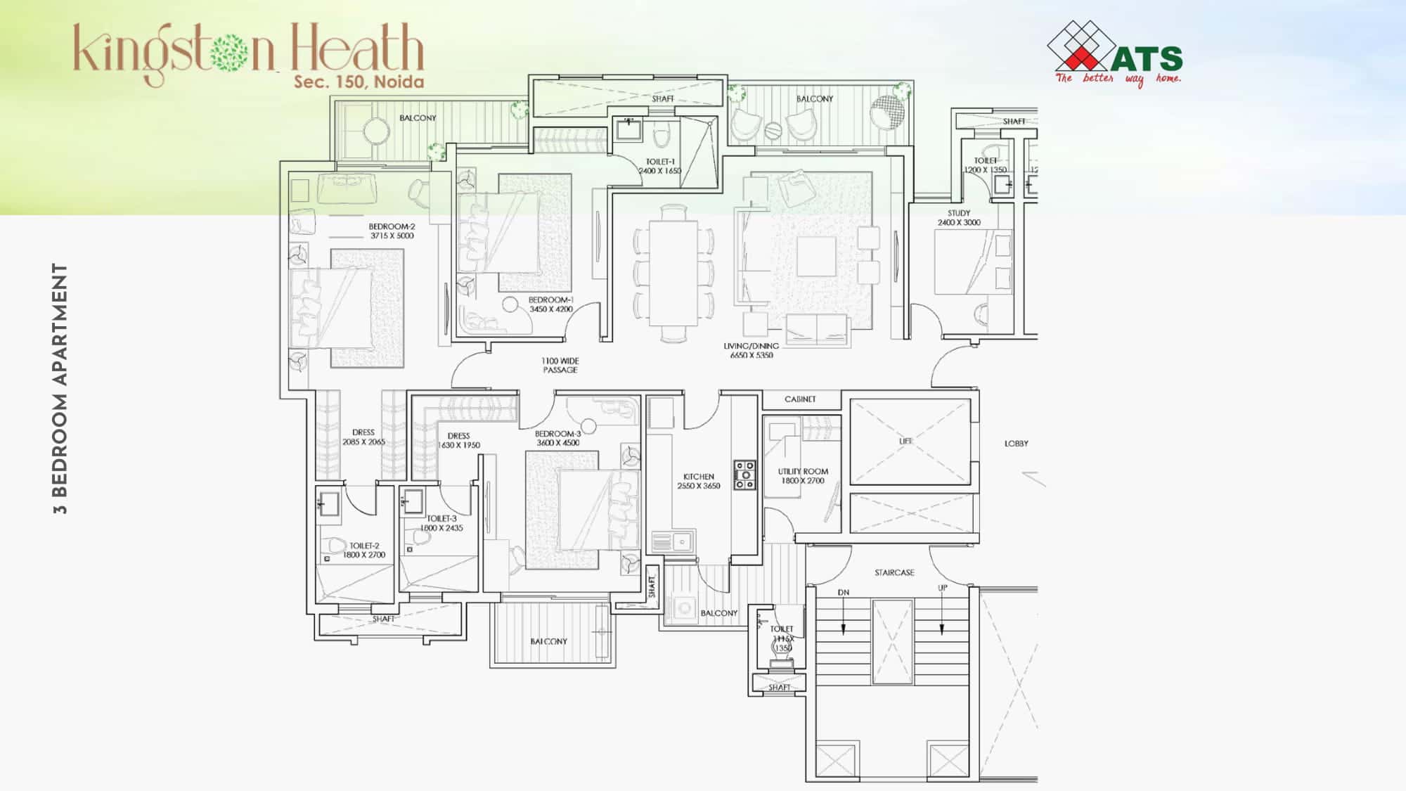 ATS Kingston Heath offers spacious 3 BHK and 4 BHK luxury apartments designed for families who value comfort, openness, and refined living. The 3 BHK homes (approx. 2,350 sq. ft.) feature generous living and dining areas, well-proportioned bedrooms, and wide balconies that invite light and breeze. The 4 BHK residences (approx. 3,300 sq. ft.) elevate luxury with grand layouts, multiple balconies, and expansive interiors suited to upscale urban lifestyles. Tower orientation and floor planning are optimized for sunlight, ventilation, and energy efficiency, while premium specifications and ATS’s renowned construction quality add lasting value.