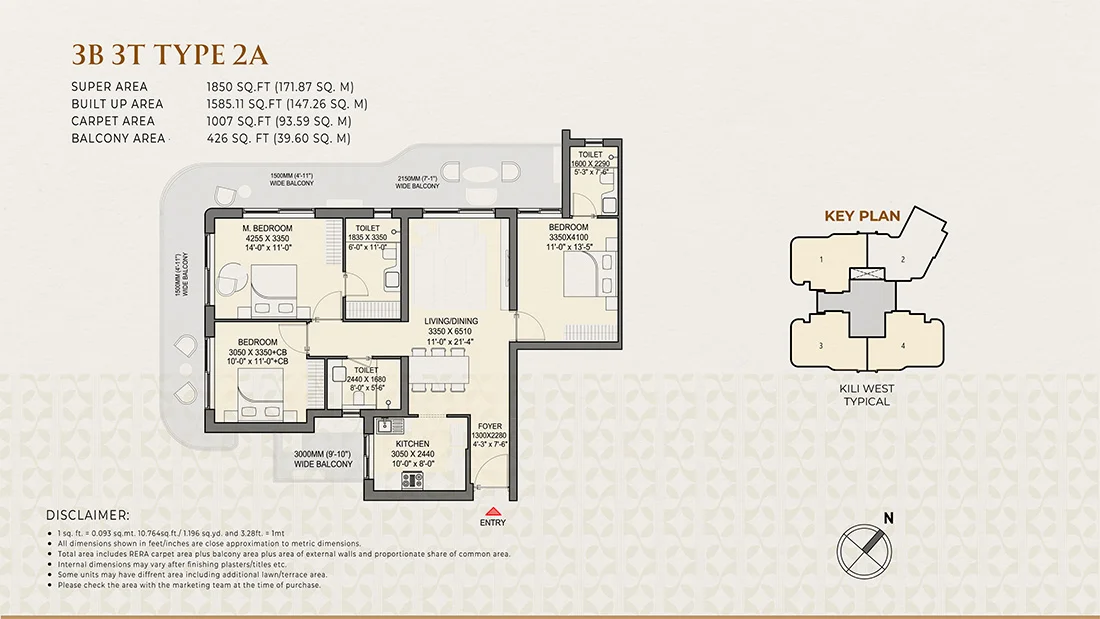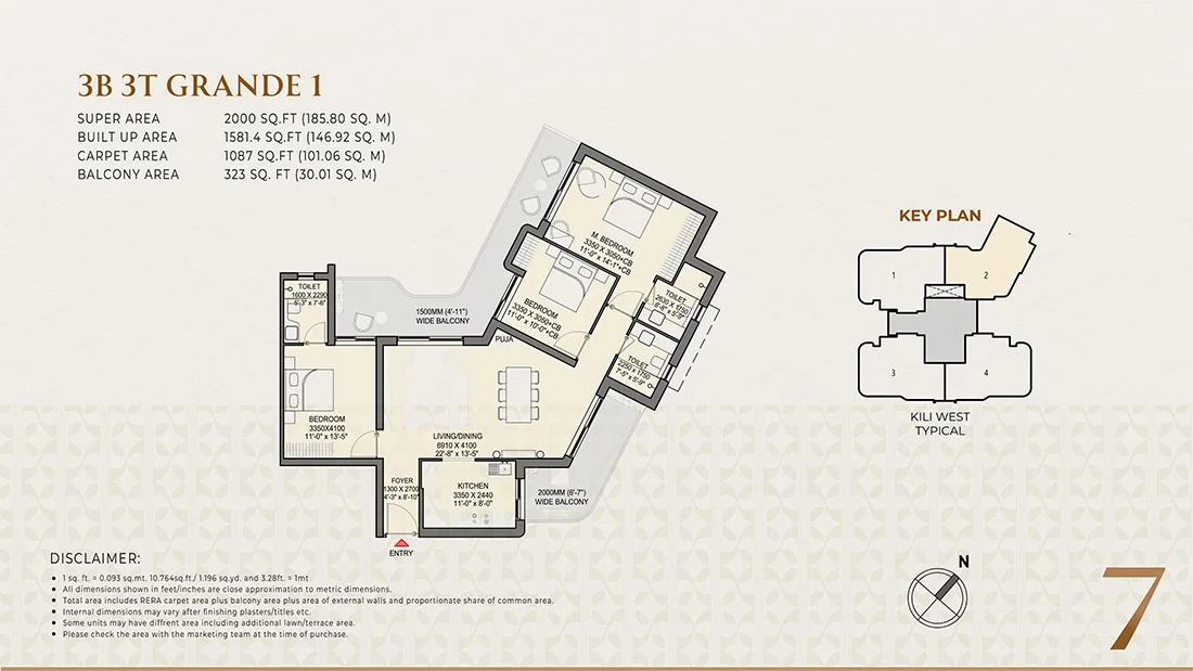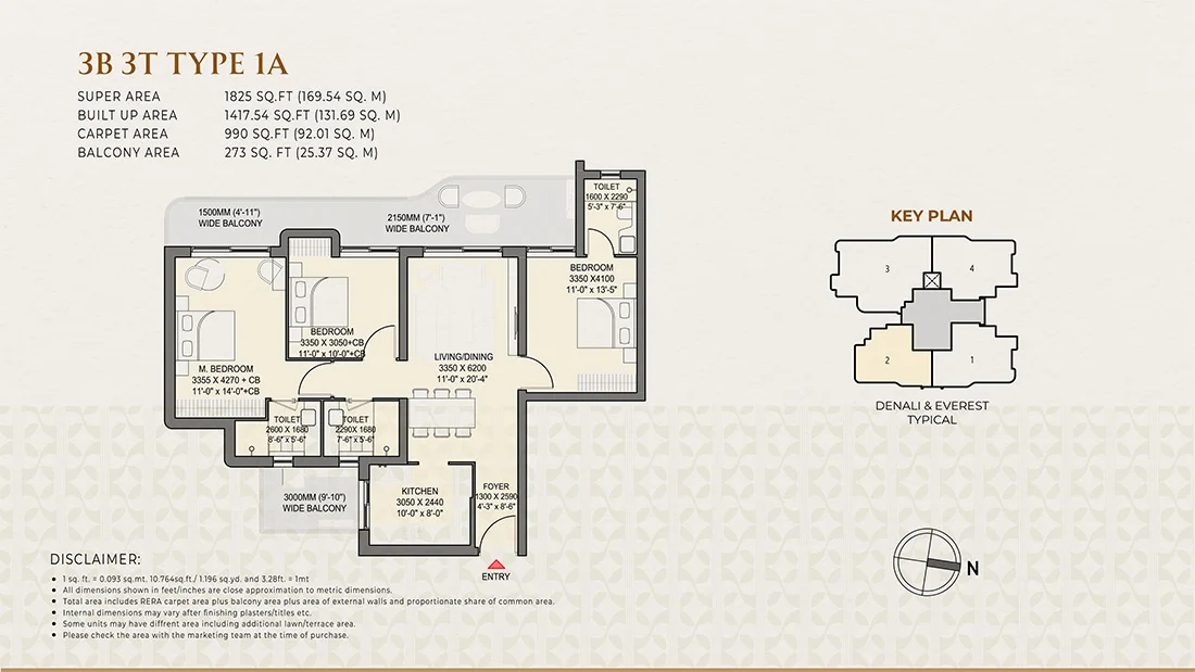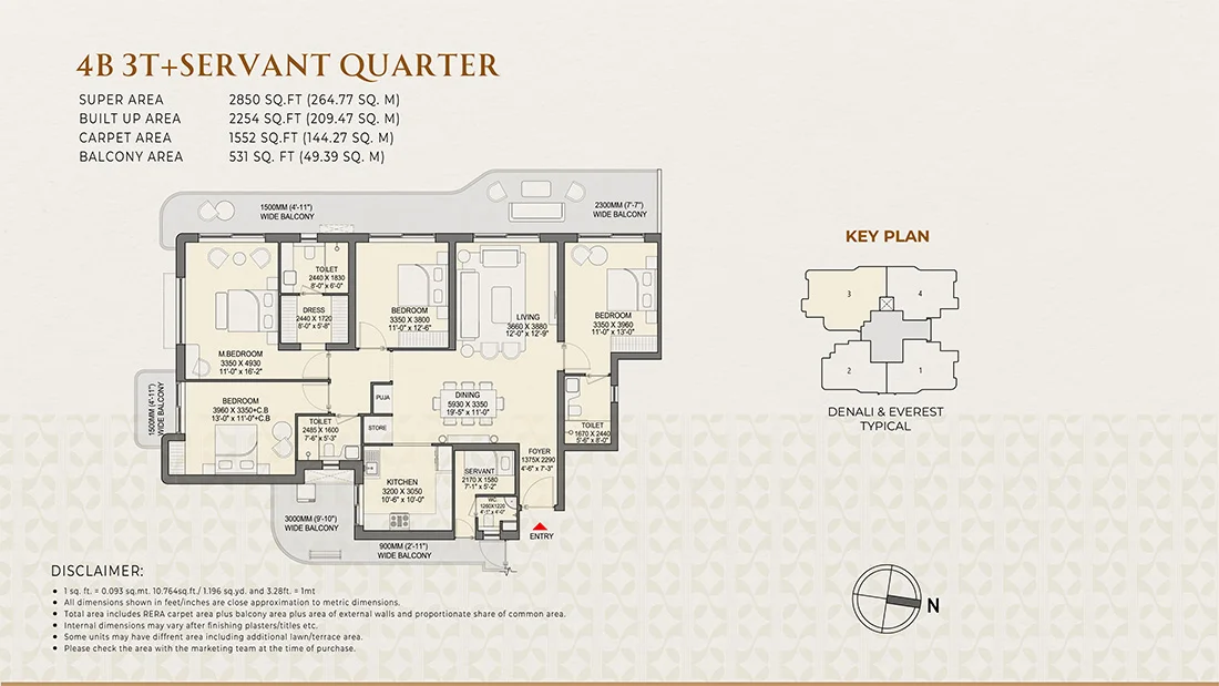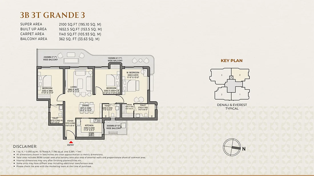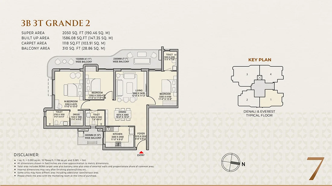 The project offers luxury 3 BHK and 4 BHK apartments, designed with spacious layouts, three-side openness, and wrap-around balconies.