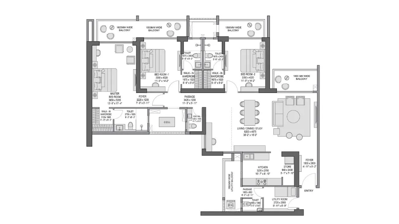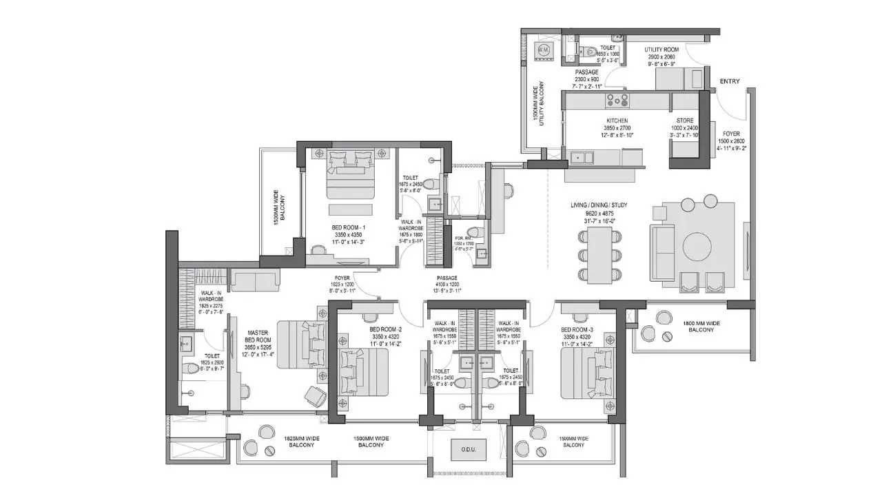 Experion Elements offers spacious 3 BHK and 4 BHK luxury residences, designed for families who seek large, well-planned living spaces. The 3 BHK apartments span approximately 2,975 sq. ft., while the 4 BHK residences offer an expansive area of around 3,530 sq. ft. Each home features grand living and dining areas, wide balconies, premium fittings, and elegant finishes. With limited residences per floor, the project ensures exclusivity, peace, and a sense of openness rarely found in urban developments.