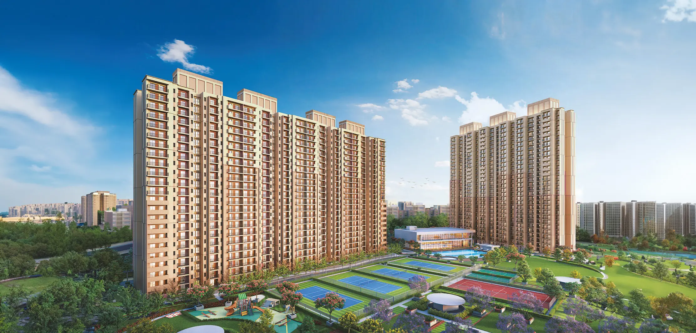 With its sprawling 28 acres of landscaped gardens, water bodies, and open green spaces, Ivory County promotes a healthy and balanced lifestyle. Additional facilities include a grand triple-height entrance lobby, temperature-controlled swimming pool, jogging and walking paths, children’s play areas, yoga and meditation zones, and multi-purpose event courts—creating a self-sufficient community where residents can relax, stay active, and celebrate life.