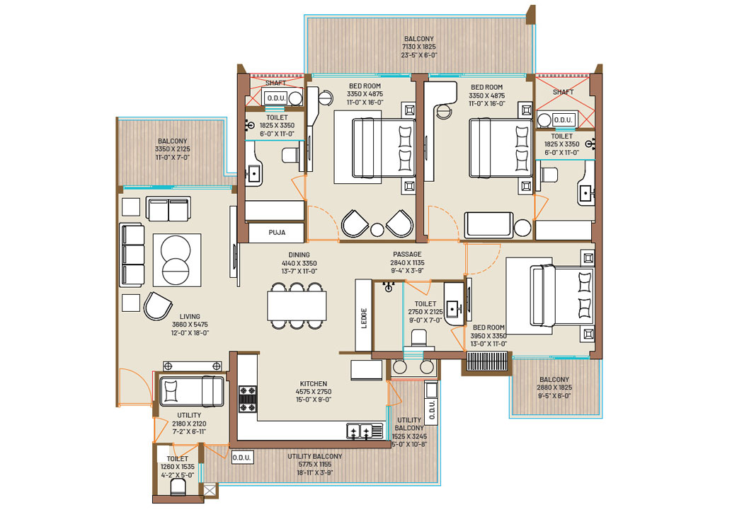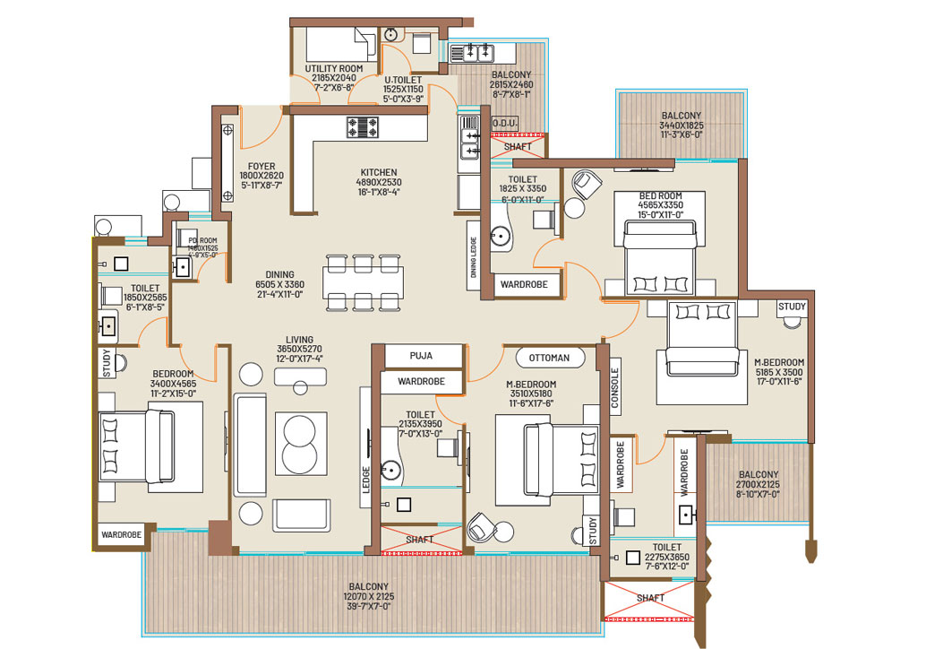 | 4 BHK + 4 Toilet + Utility | 2727 | 3195 Sq.ft. | On Request |