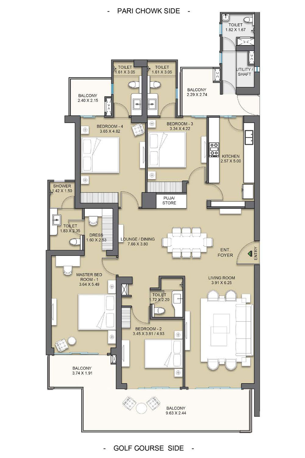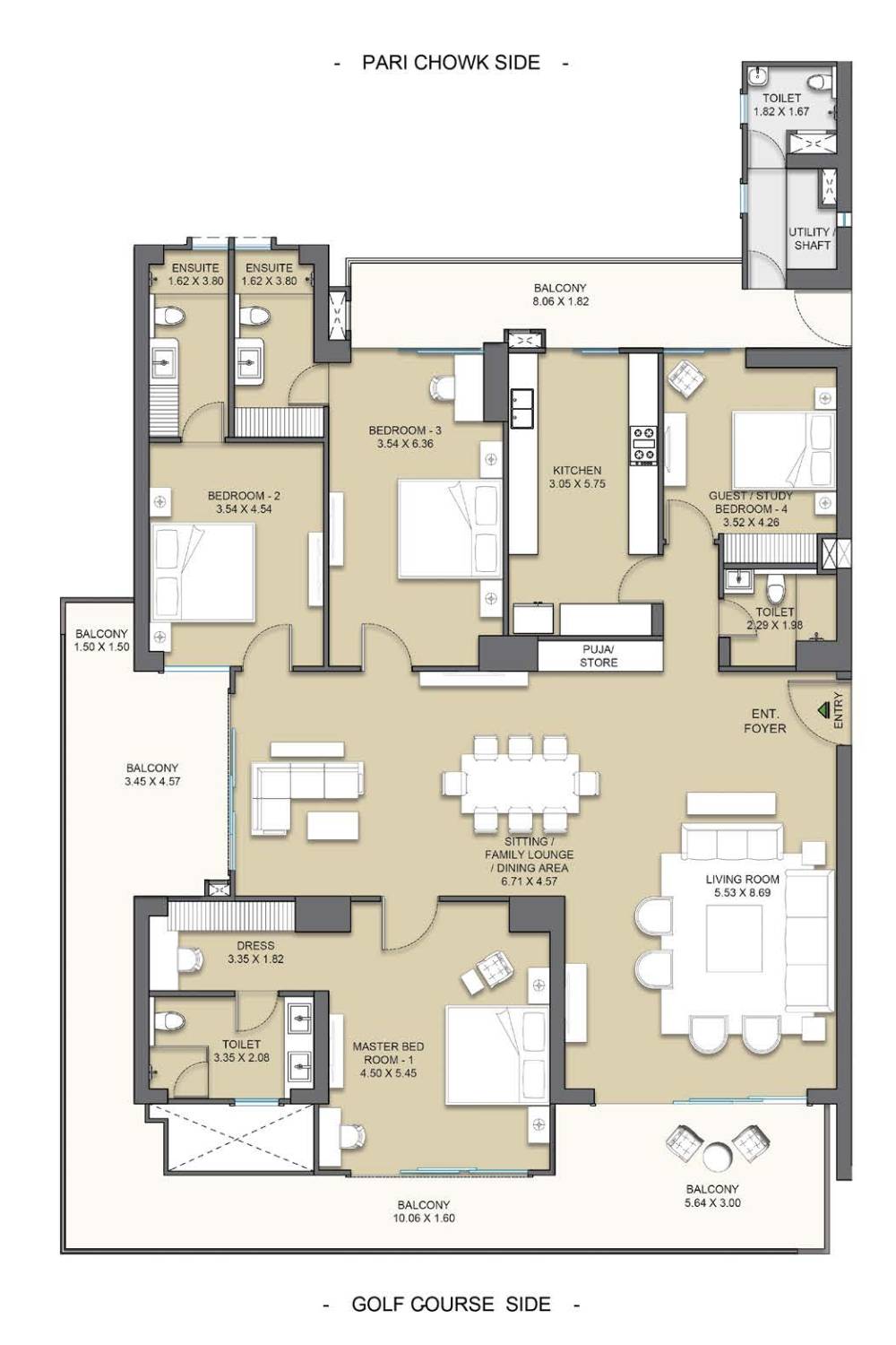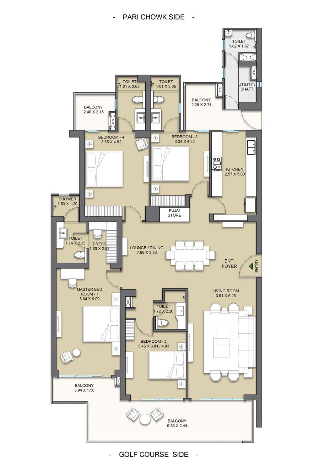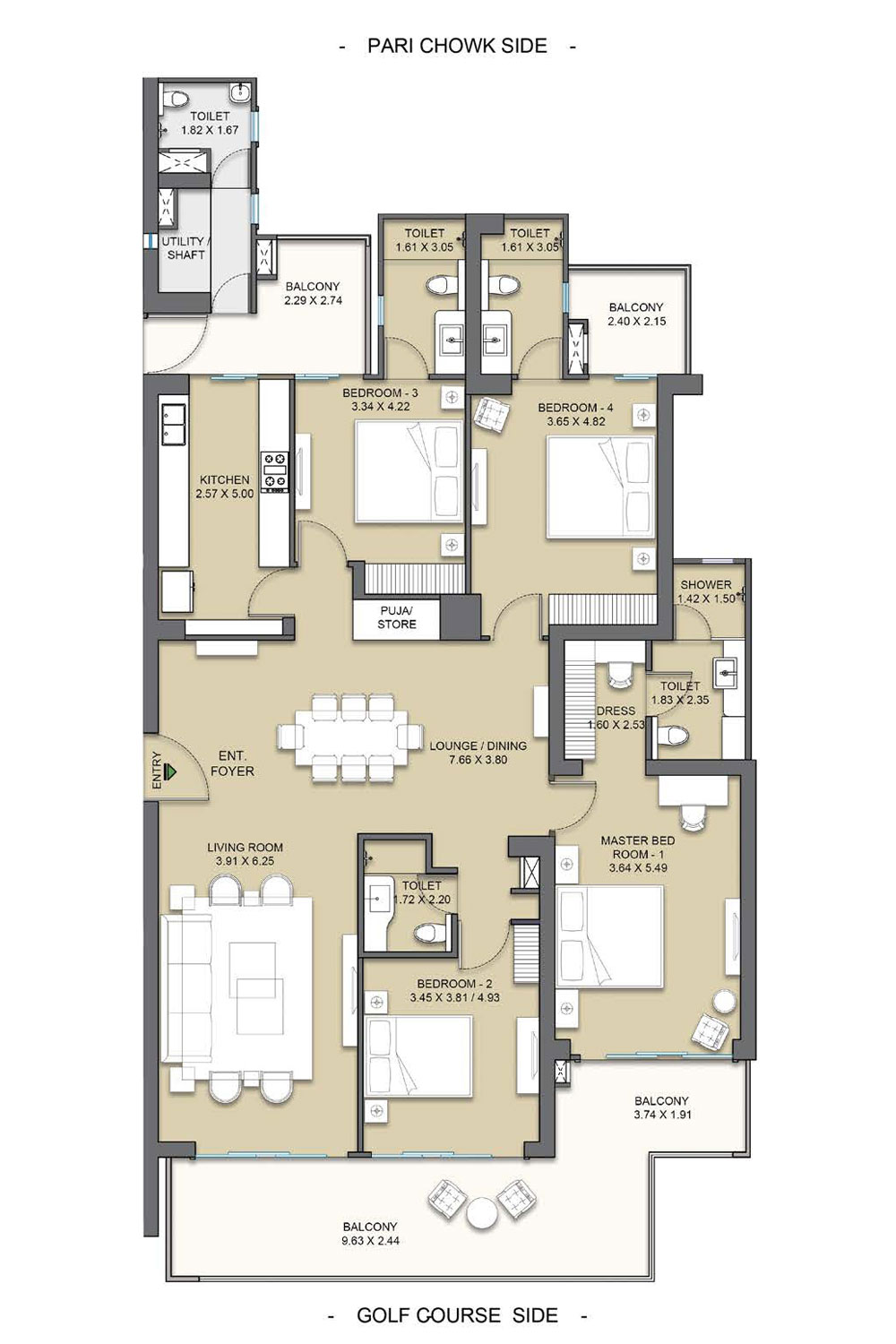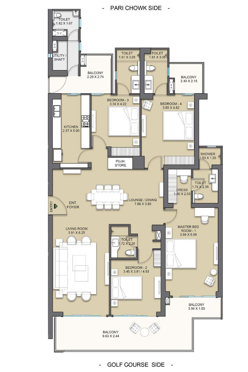 The project offers spacious 4 BHK + Utility and 4 BHK Large + Utility apartments, along with select bespoke villas, crafted for luxury family living.