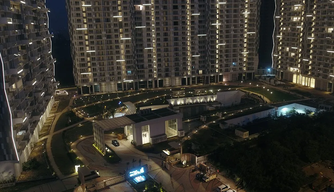 Luxury specifications define every aspect of Prateek Edifice. Apartments are equipped with VRV air-conditioning systems for energy-efficient climate control, complemented by thermally insulated roofs that enhance sustainability and indoor comfort. The grand entrance lobbies, soaring up to an impressive 26 feet in height, create a striking first impression and reflect the project’s premium positioning. Each tower is serviced by two high-speed elevators and one dedicated service lift, while golf cart services allow effortless movement across the lush landscaped campus. A 100% power backup system ensures uninterrupted living at all times.