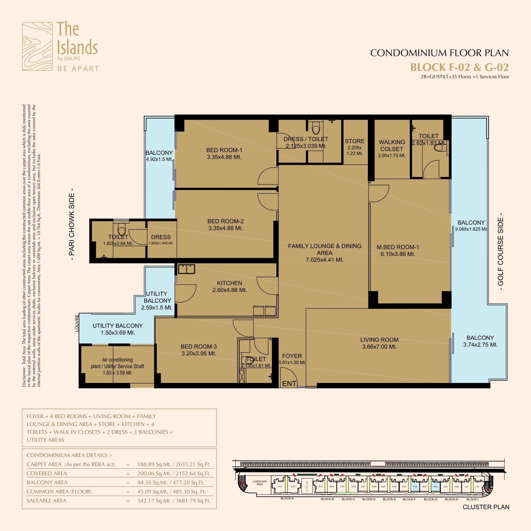 Life at The Islands by Gaurs is enhanced by three distinct amenity zones that together create a holistic living environment. The Ivory Coast, the foundation living zone, focuses on everyday wellness and comfort with open gyms, yoga and meditation areas, landscaped sit-outs, senior citizen spaces, water features, children’s and pet play zones, walking tracks, and activity areas. Residents enjoy access to the Gold Coast Clubhouse, a premium social and recreational hub featuring a family swimming pool, jacuzzi, fitness center, indoor games, coffee lounge, library, indoor games, bowling alley, heated pool, sauna and steam rooms, salon, party spaces, mini theater, cigar lounge, sports bar and leisure spaces. A unique highlight of the project is The Orbit Skywalk, an elevated community walkway above the 23rd floor that connects towers while offering scenic views and interactive spaces. Additional amenities include landscaped gardens, golf-facing terraces, jogging and walking tracks, yoga and meditation zones, children’s play areas, senior citizen sit-out spaces, pet play zones, and dedicated wellness zones—creating a balanced lifestyle for all age groups.